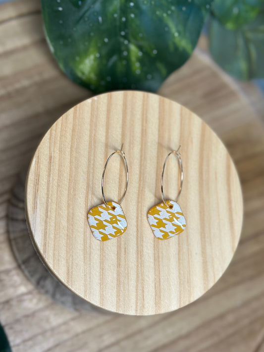 Square Pendant Hoop Earrings - Mustard & White Houndstooth