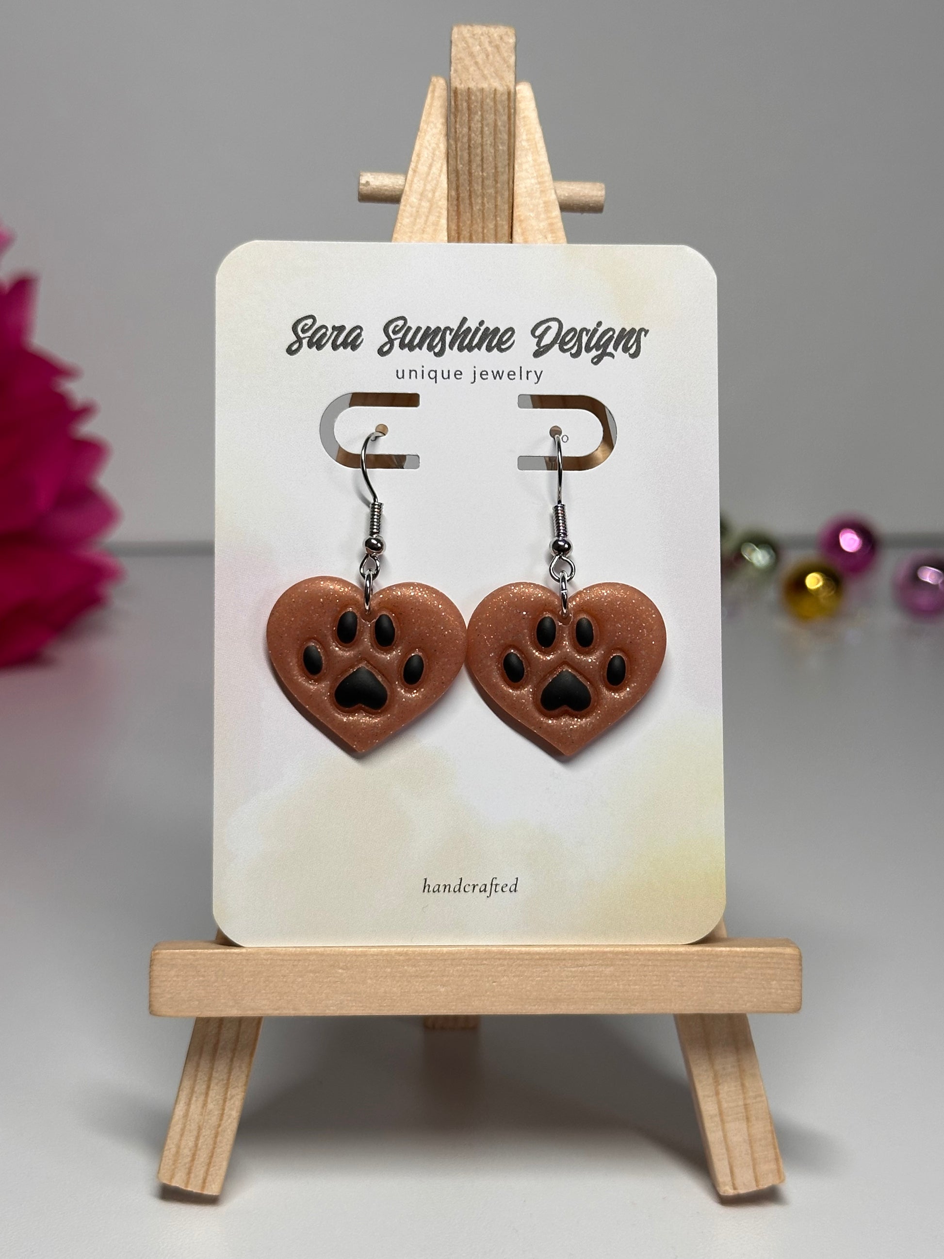 Paw Print Heart Earrings - Tan & Black